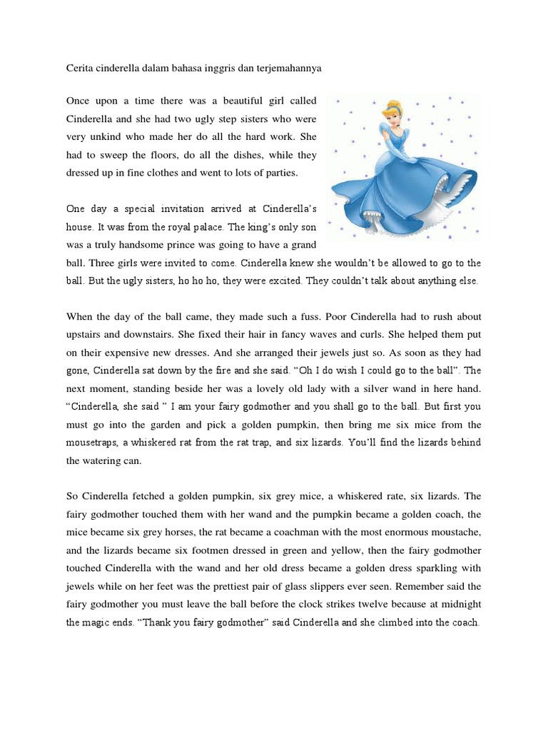 The wolf thought that was a good idea so he sat down and waited. A real lady would never go to a ball on foot. Cerita cinderela dalam bahasa inggris tentang seorang gadis yang tinggal bersama ibu dan dua saudara tirinya tetapi layaknya pembantu.